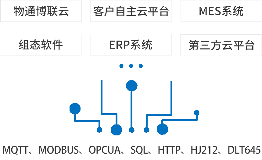 北向支持接入物通博聯(lián)云平臺(tái),客戶自主開發(fā)的云平臺(tái),第三方云平臺(tái)(根云、美云、華為、阿里、百度、微軟等IOT云平臺(tái)),組態(tài)軟件、MES系統(tǒng)、行業(yè)監(jiān)控平臺(tái)等工業(yè)軟件