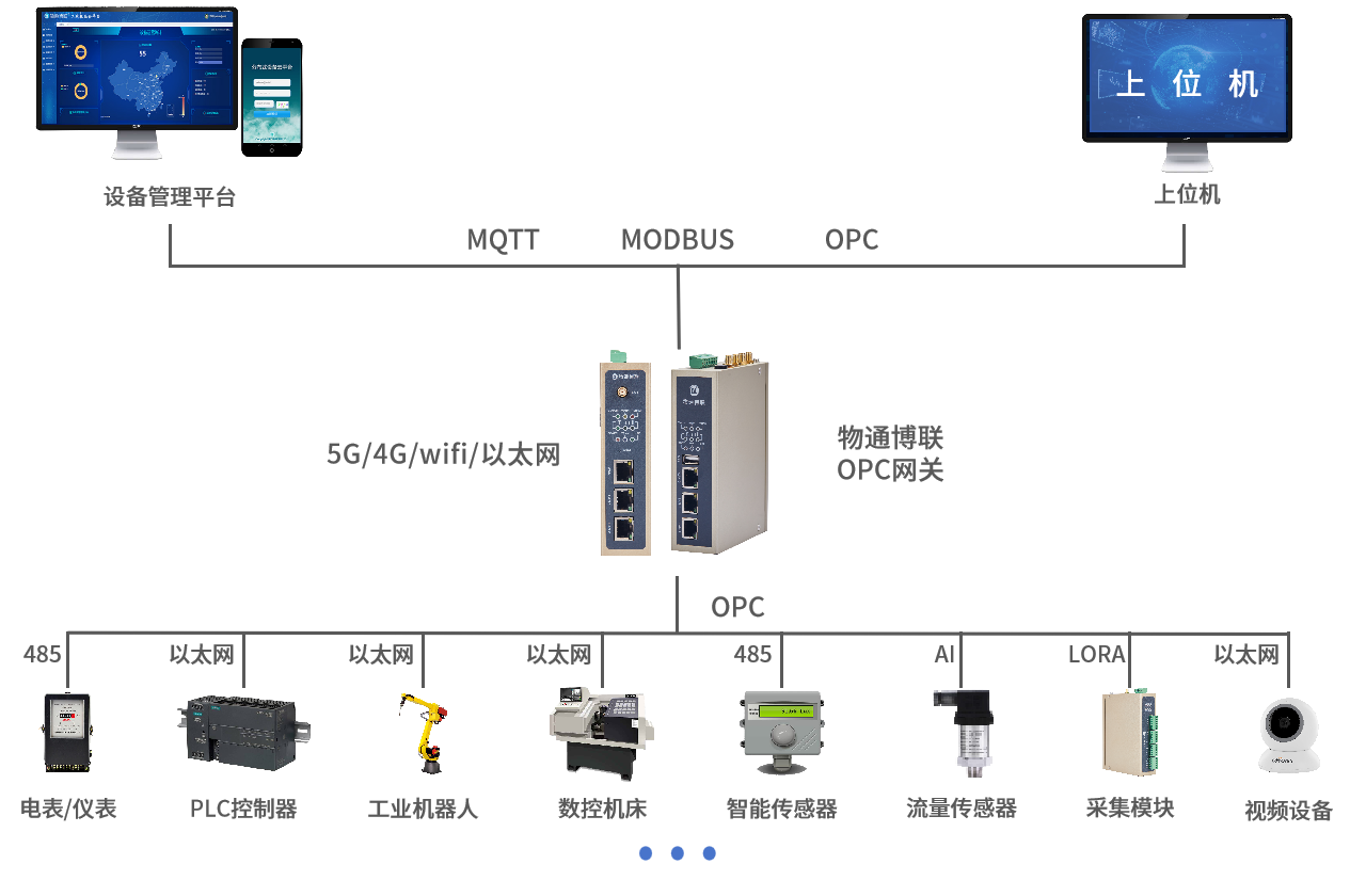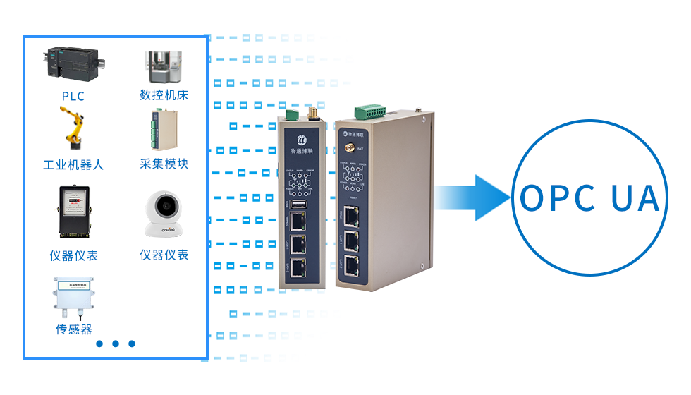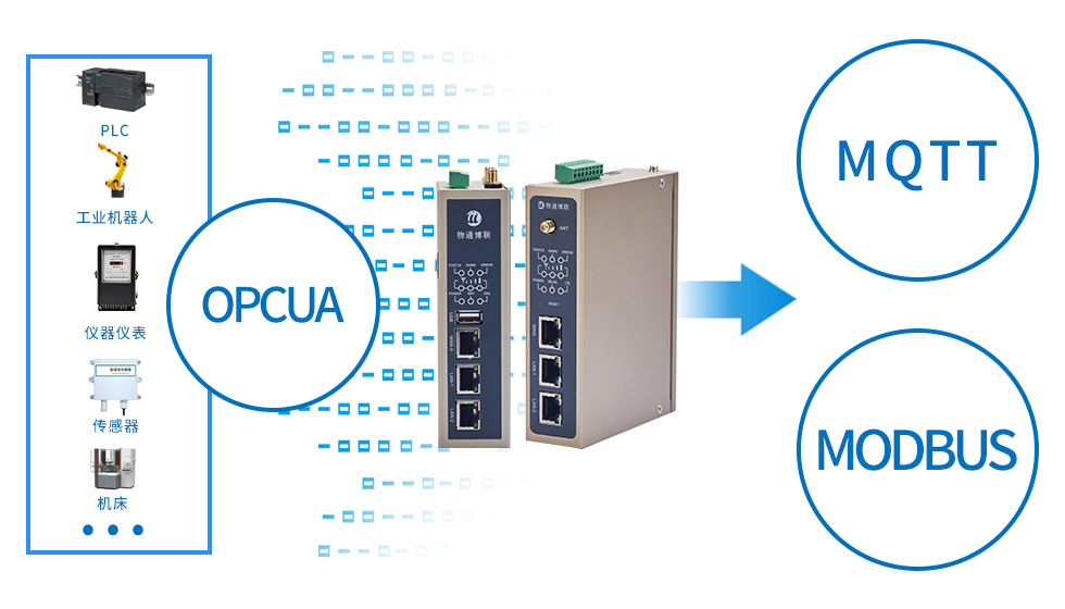 物通博聯(lián)OPC網(wǎng)關(guān)具有設(shè)備聯(lián)網(wǎng)、數(shù)據(jù)采集、協(xié)議解析、邊緣計算、云端接入等功能,支持OPC UA協(xié)議解析數(shù)據(jù)采集,能夠連接到PLC、儀器儀表、傳感器、數(shù)控機(jī)床、DCS、SCADA等,實時采集數(shù)據(jù)并通過Modbus/MQTT協(xié)議傳輸?shù)皆破脚_或本地上位機(jī),支持采集設(shè)備數(shù)據(jù)通過OPC UA協(xié)議轉(zhuǎn)發(fā)給組態(tài)軟件、上位機(jī)軟件、云平臺,實現(xiàn)設(shè)備遠(yuǎn)程監(jiān)控、遠(yuǎn)程管理。