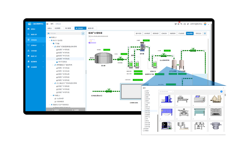 通過將網(wǎng)關的數(shù)據(jù)接入到物通博聯(lián)工業(yè)數(shù)據(jù)云平臺,可以實現(xiàn)對PLC的數(shù)據(jù)進行遠程監(jiān)控,通過平臺的組態(tài)功能可以自由繪制組態(tài)監(jiān)控畫面,實現(xiàn)電腦端和手機端的設備運行狀態(tài)和工藝流程的可視化組態(tài)監(jiān)控。