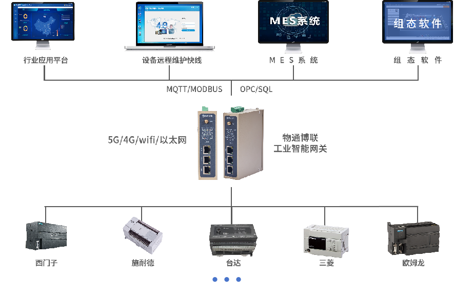 北向支持接入物通博聯(lián)云平臺,客戶自主開發(fā)的云平臺,第三方云平臺(根云、美云、華為、阿里、百度、微軟等IOT云平臺),組態(tài)軟件、MES系統(tǒng)、行業(yè)監(jiān)控平臺等工業(yè)軟件