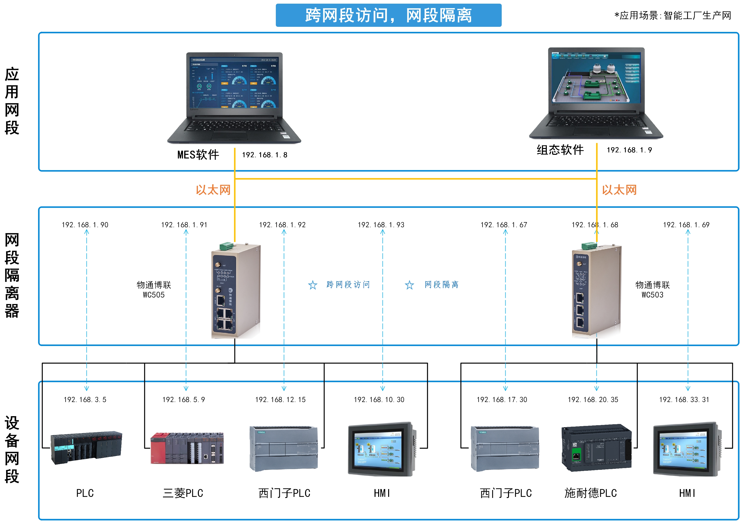WC503網(wǎng)段隔離器(NAT轉(zhuǎn)換網(wǎng)關(guān))適用于生產(chǎn)網(wǎng)絡(luò)對(duì) PLC、HMI、CNC、DCS、MES等網(wǎng)絡(luò)通訊和數(shù)據(jù)采集,兼有跨網(wǎng)段隔離和IP轉(zhuǎn)換的功能。同時(shí)支持2臺(tái)以上設(shè)備(如PLC、CNC等)網(wǎng)段隔離和NAT 轉(zhuǎn)換;車間多個(gè)設(shè)備,如果有不同網(wǎng)段的IP地址,則可以統(tǒng)一成同一網(wǎng)段的IP地址,進(jìn)行設(shè)備(PLC、CNC)的在線編程、數(shù)據(jù)采集、遠(yuǎn)程管理等各種跨網(wǎng)段訪問(wèn)。