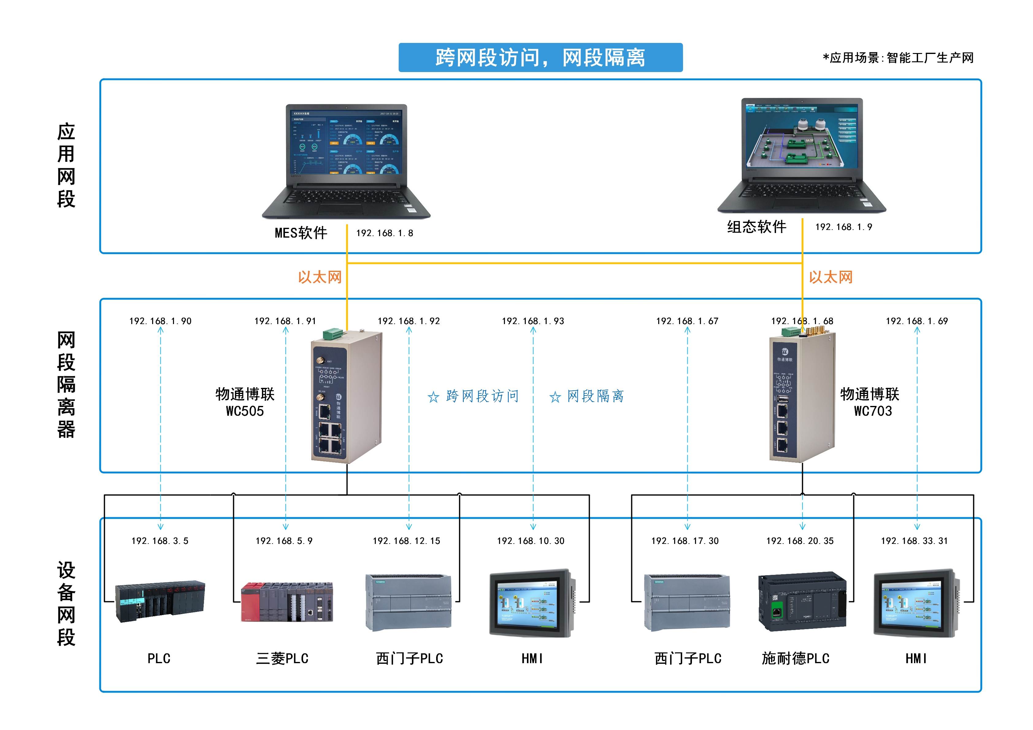 WC703網(wǎng)段隔離器(NAT轉(zhuǎn)換網(wǎng)關(guān))適用于生產(chǎn)網(wǎng)絡(luò)對 PLC、HMI、CNC、DCS、MES等網(wǎng)絡(luò)通訊和數(shù)據(jù)采集,兼有跨網(wǎng)段隔離和IP轉(zhuǎn)換的功能。同時支持2臺以上設(shè)備(如PLC、CNC等)網(wǎng)段隔離和NAT 轉(zhuǎn)換;車間多個設(shè)備,如果有不同網(wǎng)段的IP地址,則可以統(tǒng)一成同一網(wǎng)段的IP地址,進(jìn)行設(shè)備(PLC、CNC)的在線編程、數(shù)據(jù)采集、遠(yuǎn)程管理等各種跨網(wǎng)段訪問。